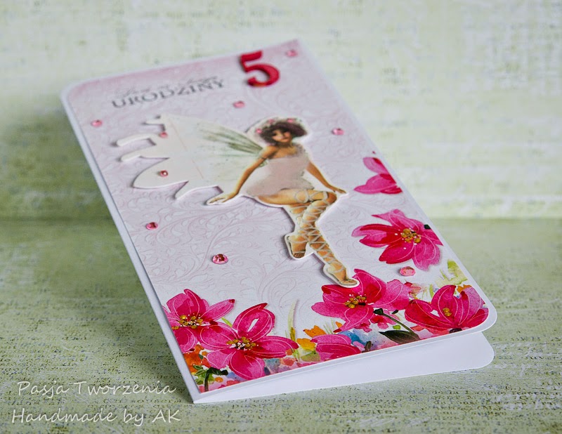 Today's card was prepared for my niece. She is already 5-years-old young lady who loves pink colour, flowers and stories for little girls. It's why I decided to make pink card with flowers and a fairy.
